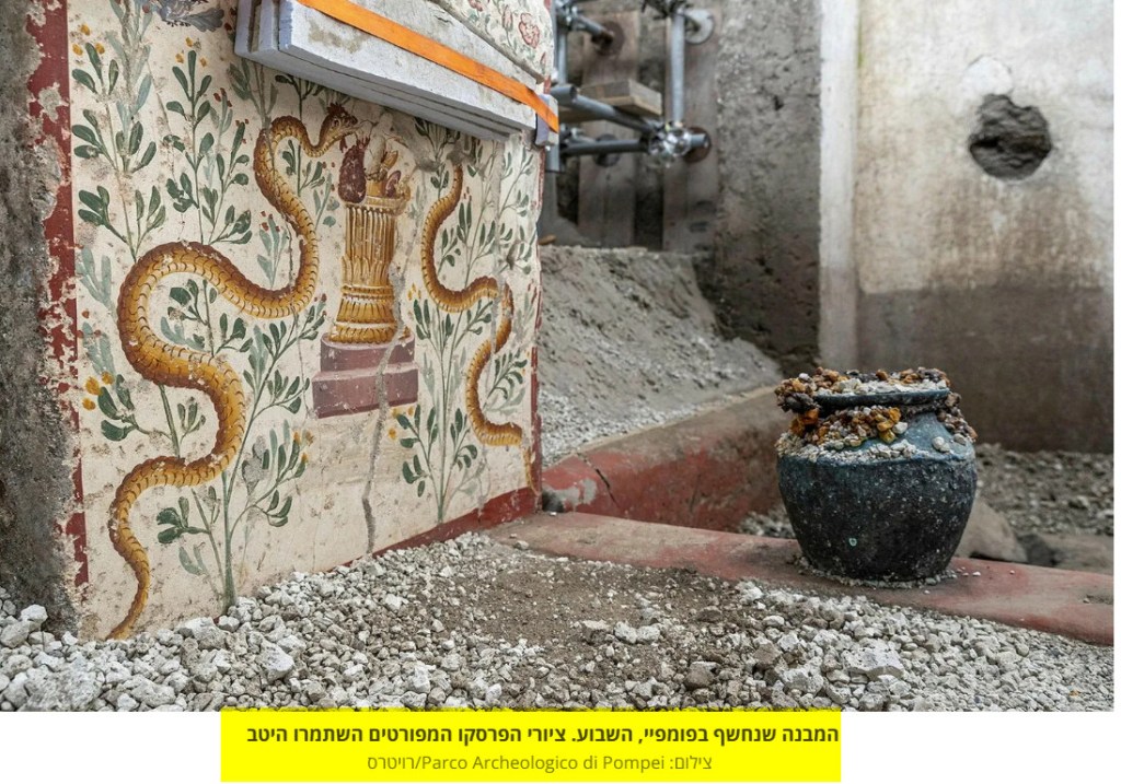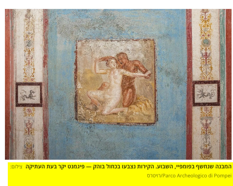 קבוצת ארכיאולוגים התקבצה בהתרגשות בחדר החדש שנחשף בחפירות באתר פומפיי. זה היה ביולי האחרון, והחדר טרם נפתח לציבור, אך הנוכחים זכו להיות מהראשונים שראו מקרוב את הקירות שנצבעו בכחול בוהק — פיגמנט יקר בעת העתיקה. ציורי הפרסקו המפורטים בחלל הכילו דימויים מתחום החקלאות. הם השתמרו היטב — גם 2,000 שנה לאחר שצוירו.